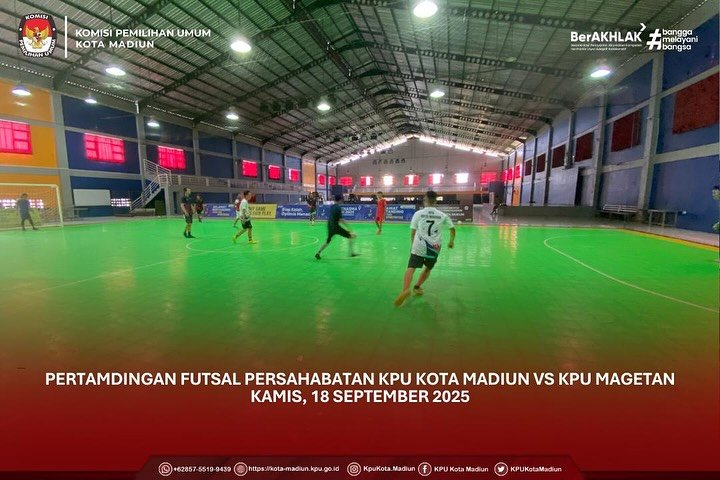 #TemanPemilih MADIUN - Komisi Pemilihan Umum (KPU) Kota Madiun dan KPU Kabupaten Magetan menjalin silaturahmi melalui pertandingan futsal persahabatan pada hari ini. Laga yang digelar di GOR Cendikia, Kota Madiun ini, berlangsung dengan penuh semangat sportivitas.
