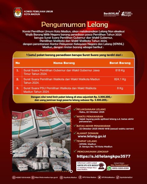 Panitia Lelang KPU Kota Madiun bersama Kantor Pelayanan Kekayaan Negara dan Lelang (KPKNL) Madiun. Mengadakan Lelang secara Online dengan Sistem Open Bidding (Penawaran Terbuka) berupa Surat Suara Pemilihan Gubernur dan Wakil Gubernur, Pemilihan Walikota dan Wakil Walikota Tahun 2024 Dengan nilai total limit paket lelang di atas sejumlah Rp. 3.300.200,- dan uang jaminan bagi peserta lelang sebesar Rp. 3.300.200,-