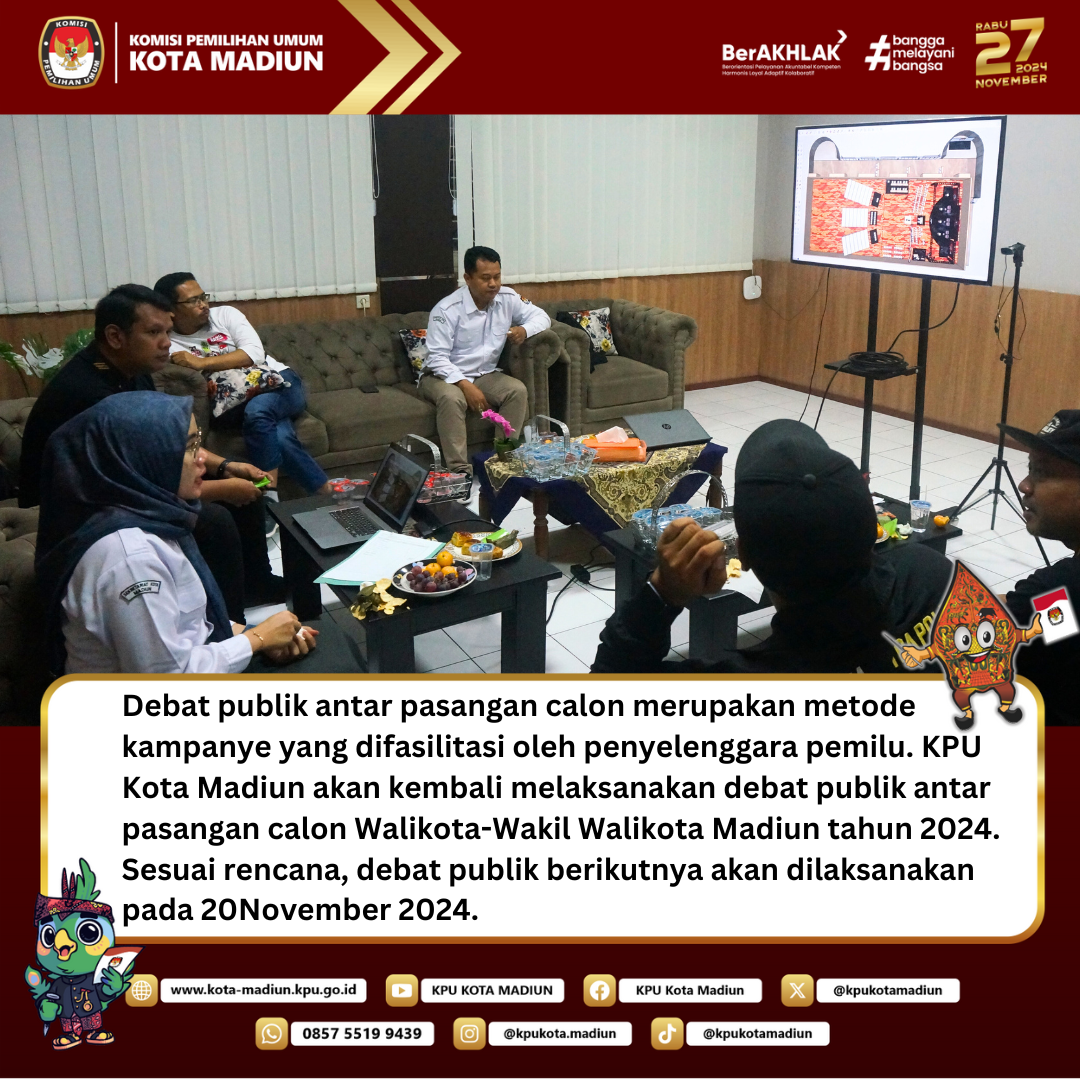 KOTA MADIUN – KPU Kota Madiun akan kembali menggelar debat publik antar pasangan calon Walikota-Wakil Walikota Madiun pemilihan tahun 2024. Debat publik merupakan metode kampanye yang difasilitasi oleh KPU Kota Madiun. Melalui debat publik tersebut, masyarakat dapat lebih mengetahui visi-misi maupun program kerja masing-masing pasangan calon.