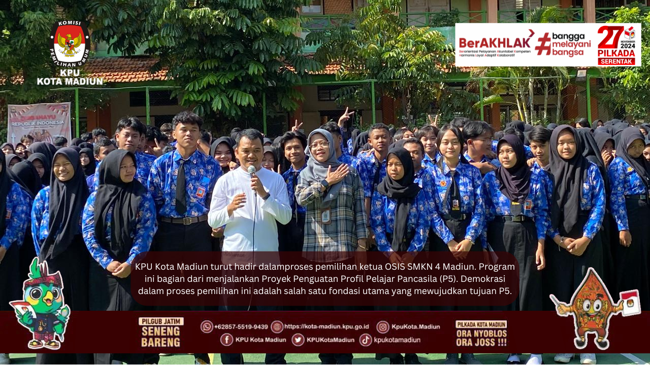 Kota Madiun - Pemilihan Ketua Organisasi Siswa Intra Sekolah (OSIS) adalah salah satu contoh nyata dari pelaksanaan prinsip demokrasi di lingkungan sekolah. Demokrasi dalam pemilihan ini adalah cerminan dari peran siswa dalam memilih pemimpin yang akan mewakili dan mengadvokasi kepentingan mereka di sekolah. Seperti pemilihan OSIS di SMK Negeri 4 Madiun yang turut dihadiri oleh KPU Kota Madiun