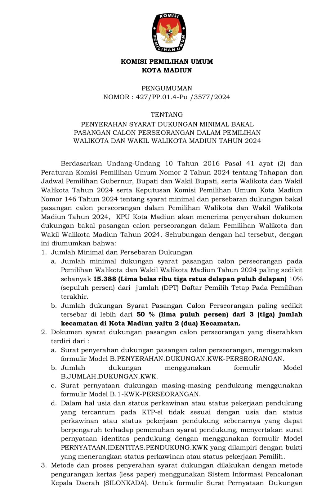 #TemanPemilih Berikut disampaikan Pengumuman Penyerahan Syarat Dukungan Minimal Pasangan Calon Perseorangan Dalam Pemilihan Walikota dan Wakil Walikota Madiun Tahun 2024