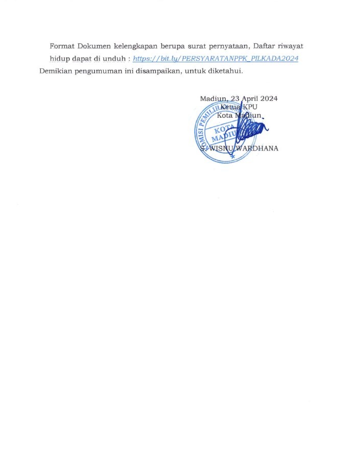 Pengumuman Seleksi Calon Anggota PPK Pilkada Tahun 2024 di Kota Madiun