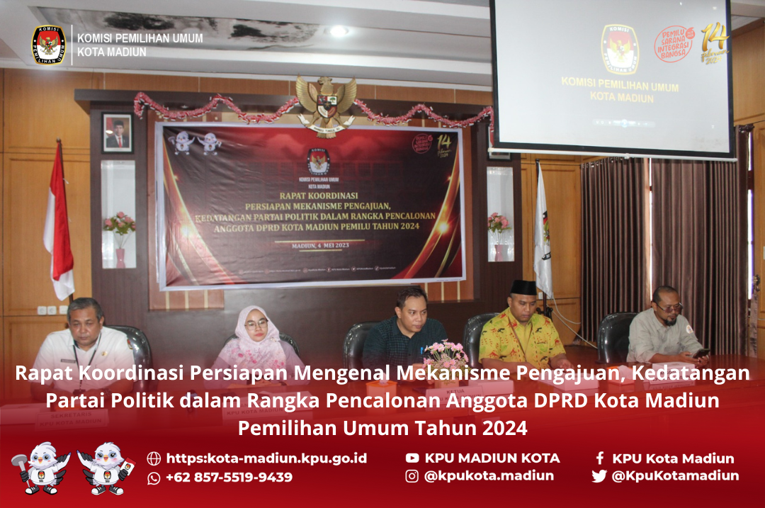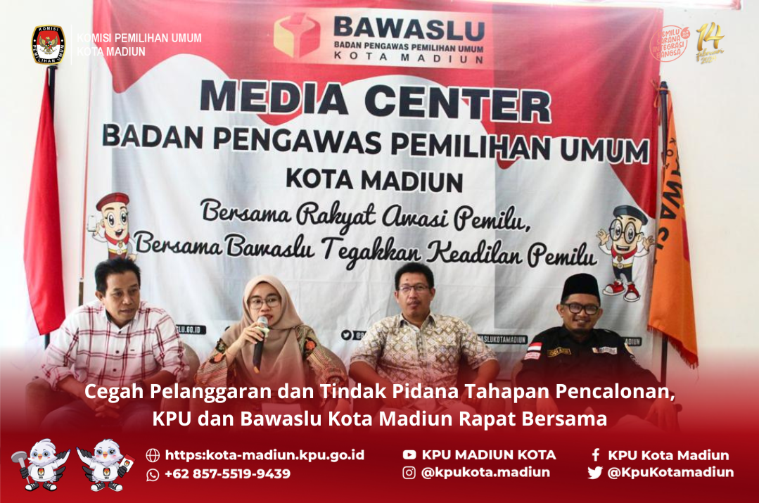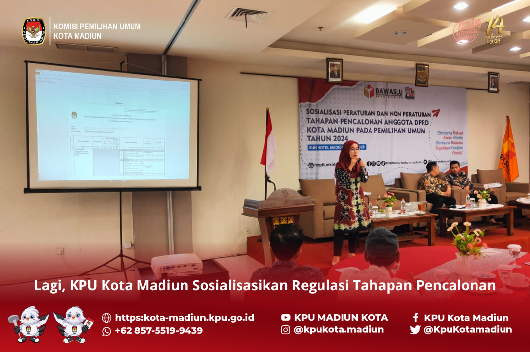 Madiun (5/5), Badan pengawas Pemilu kota Madiun Menyelenggarakan sosialisasi di regulasi tahapan pencalonan yang hadir sebagai Narasumber divisi hukum KPU kota Madiun, Pita Anjarsari dan akademisi dari universitas Merdeka Madiun ikan fakultas hukum Dr. Sigit Sapto Nugroho,S.H., M.Hum. Pada kegiatan ini membahas tentang regulasi tahapan pencalonan Dan partisipasi masyarakat dalam Pemilu tahun 2024. Pada kesempatan ini divisi hukum KPU kota Madiun kembali mensosialisasi kan tahapan pencalonan yang terdapat dalam PKPU nomor 10 tahun 2023 dan keputusan KPU nomor 352 tahun 2023. Pada sosialisasi kali ini tidak hanya bertujuan untuk memastikan kembali bahwa peserta Pemilu dalam hal pengajuan bakal calon telah sesuai dengan regulasi yang berlaku namun juga memastikan bahwa tidak akan terjadi pelanggaran pelanggaran pada proses pengajuan calon hingga tahapan pencalonan ini berakhir. Kegiatan yang diselenggarakan di San hotel kota Madiun ini dihadiri pula oleh stakeholder terkait dan peserta Pemilu di kota Madiun. Dalam materinya kita menyampaikan bahwa “Memahami regulasi hingga hal teknis penting bagi parpol sebelum melakukan pengajuan bakal calon, mulai dari pemenuhan dokumen administrasi bakal calon hingga memgetahui bagaimana langkah selanjutnya jika dalam pengajuan ada hal-hal lain yang terjadi misalnya bacaleg mundur atau persyaratan administrasi tidak terpenuhi hingga menjelang batas akhir pengajuan”. Selain itu divisi hukum KPU kota Madiun juga mengulas kembali hal hal yang dapat menimbulkan pelanggaran administrasi, pelanggaran kode Etik oleh penyelenggara, tindak pidana Pemilu, dan atau sengketa proses. Dengan memahami regulasi yang ada serta hal hal teknis yang seharusnya dilakukan sesuai dengan petunjuk teknis dalam keputusan KPU nomor 352 tahun 2023 di kota Madiun dalam tahapan pencalonan tidak terjadi pelanggaran pelanggaran ataupun tindak pidana Pemilu hingga Sengketa proses. Demikian juga Dr. Sigit dalam materinya mengungkapkan bahwa Era sekarang sudah saatnya generasi muda peduli terhadap Pemilu khususnya Pemilu tahun 2024 ini. Sudah saatnya partai politik menggandeng bahkan mengajak para generasi muda untuk bersama berpartisipasi sebagai peserta Pemilu. Tentu dengan keterlibatan para generasi Millennial atau generasi muda dalam kontestasi politik makan mengalami berbagai macam kendala misalnya sikap apatis yang di tunjukkan oleh para pemuda ketika mereka diajak untuk berpartisipasi sebagai peserta Pemilu. Namun dalam sosialisasi tentu harus menemukan formulasi yang tepat sehingga dapat mengajak para generasi muda untuk berpartisipasi pada Pemilu tahun 2024. Melalui kegiatan ini dapat disimpulkan bahwa suksesnya penyelenggaraan Pemilu tahun 2024 tidak cukup hanya dengan penyelenggara Pemilu yang harus taat pada regulasi saja namun sebagai peserta Pemilu juga harus memahami dan menjalankan regulasi yang ada. Selain ituStakeholder terkait yang menyediakan dokumen administrasi bakal calon juga harus memberikan dukungan memprioritaskan pelayanan pada bakal calon yang hendak mengurus dokumen administrasi persyaratanya. dan tokoh masyarakat juga harus terlibat dalam mengawal proses tahapan Pemilu agar berjalan sesuai dengan peraturan perundang undangan.