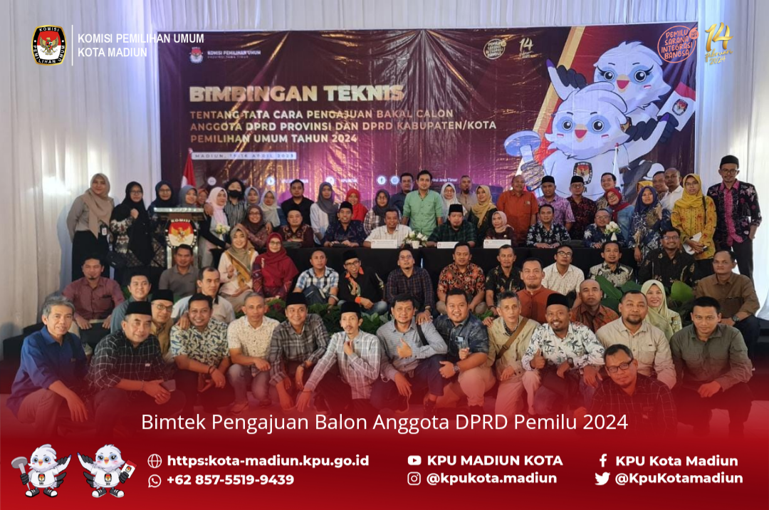 Madiun, 15 - 16 April 2023 KPU Provinsi Jawa Timur laksanakan bimbingan teknis terkait pengajuan bakal calon Anggota DPRD pada Pemilu 2024 sesuai dengan Surat Undangan Nomor : 682/PP.05.1/35/2023, Perihal : Undangan. Bimtek dimulai pukul 14.30 WIB – selesai, bertempat di Kantor KPU Kabupaten Madiun, Jl. Raya Ponorogo – Madiun No 46, Ngrobyong, Purworejo, Kec. Geger, Kab. Madiun. Acara dibuka oleh Ketua KPU Provinsi Jatim Choirul Anam.