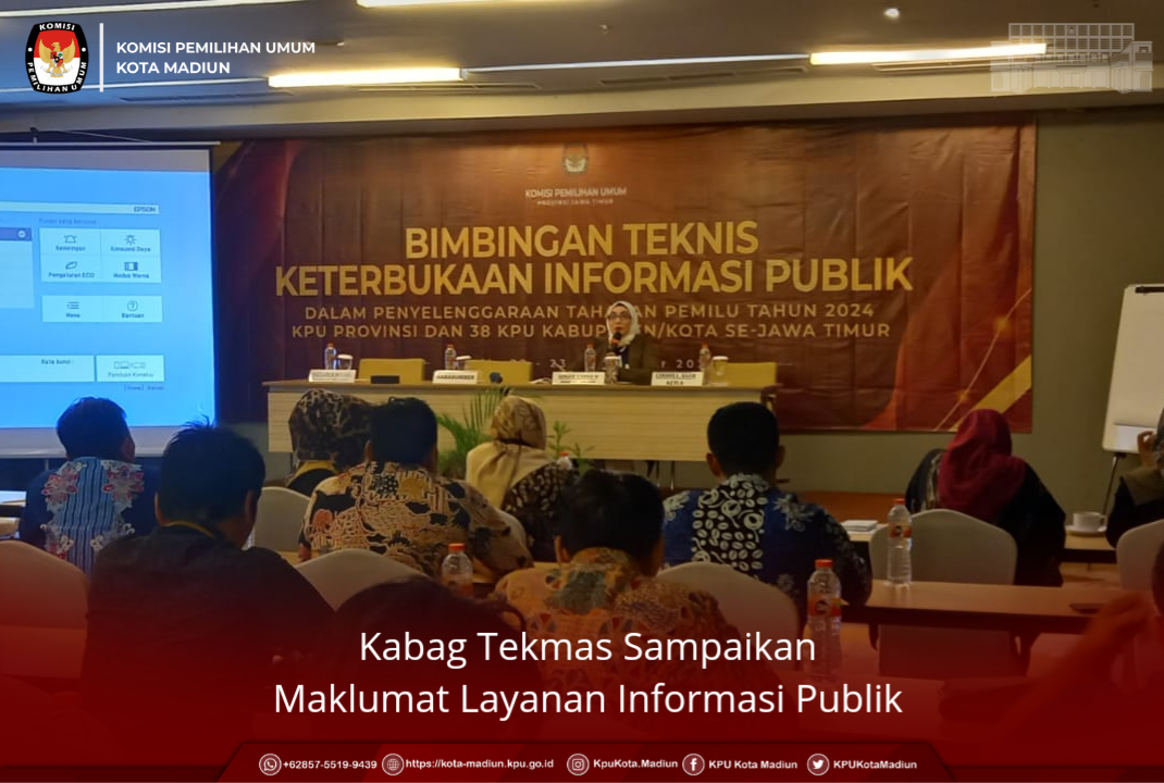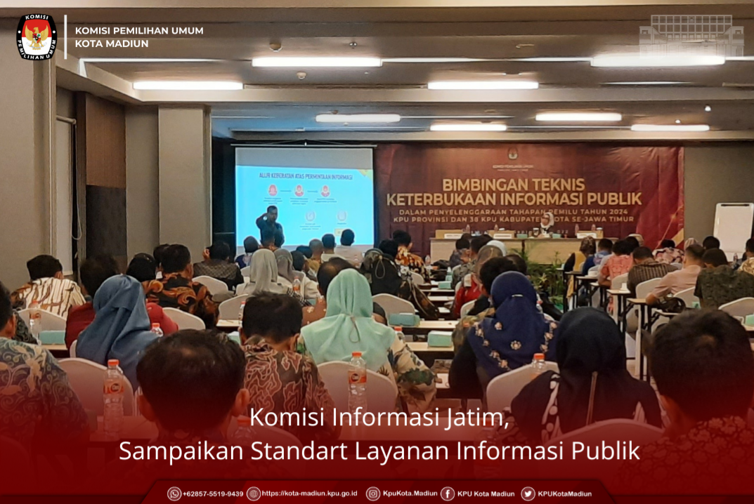 Oleh Prita Liana kota-madiun.kpu.go.id Gresik-Kamis, 22 September 2022 Komisi Informasi Provinsi Jawa Timur sampaikan materi tentang Standart Layanan Informasi Publik di tengah Bimbingan Teknis Keterbukaan Informasi Publik. Materi disampaikan oleh Edi Purwanto, Komisioner Bidang Advokasi Sosialisasi dan Edukasi Komisi Informasi Jawa Timur. Bimtek dilaksanakan oleh KPU Provinsi Jawa Timur pada hari Kamis-Jum'at tanggal 22-23 September 2022. Peserta bimtek adalah Divisi Sosdiklih, Parmas dan SDM beserta Kasubbag Tekmas dan operator e-PPID KPU Kabupaten/Kota se wilayah kerja KPU Provinsi Jawa Timur yaitu 114 orang, salah satunya adalah dari KPU Kota Madiun. Pembukaan bimtek bertempat di Ruang Mandala Bhakti Praja Kantor Bupati Gresik dan dilanjutkan dengan penyampaian materi. Dalam materi dari Komisi Informasi Jatim secara gamblang disampaikan kendala-kendala dalam pengelolaan layanan informasi publik, kewajiban bada publik dalam pelayanan informasi bahkan klasifikasi informasi publik. "Ada 7 standart layanan informasi publik, yaitu standart pengumuman, standart permintaan informasi publik, standart pengajuan keberatan, standart penetapan dan pemutakhiran daftar informasi publik, standat pendokumentasian informasi publik, standart maklumat pelayanan dan standart pengujian konsekuensi", tegas Edi dalam penyampaian materi. Sesi penyampaian materi dilanjutkan diskusi dengan peserta yang berlangsung aktif dan interaktif untuk menggali kendala-kendala yang dialami KPU kabupaten/kota serta sekaligus mendapatkan alternatif solusi.