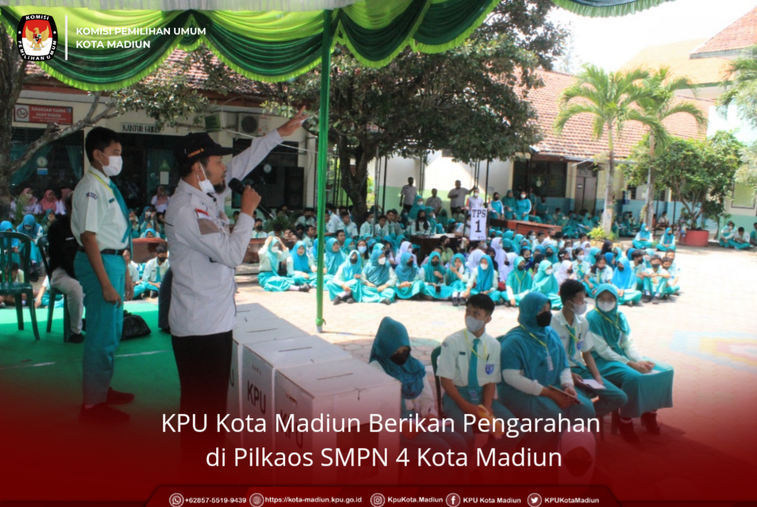 Oleh Indri kota-madiun.kpu.go.id Kota Madiun, (7/9) Komisi Pemilihan Ketua Umum Kota Madiun menghadiri undangan Pemilihan Ketua OSIS (PILKAOS) dari SMPN 4 Kota Madiun pada Rabu, (7/9/2022) yang bertempatkan di Jl. Abdulrahman Saleh No.3, Kejuron, Kec. Taman, Kota Madiun, Jawa Timur. Undangan bermaksud agar KPU Kota Madiun dapat memberikan pengarahan saat pemungutan dan penghitungan surat suara PILKAOS. Dalam kegiatan PILKAOS SMPN 4 Kota Madiun ini, KPU Kota Madiun diwakili oleh Rokhani Hidayat, Divisi Sosdiklih Parmas dan SDM beserta pejabat fungsional KPU Kota Madiun, Sumarsono, Suparmin dan Joni Hermawan staf KPU Kota Madiun. Selain memberikan pengarahan, KPU Kota Madiun juga memberikan sedikit sosialisasi yang dilanjut dengan kuis seputar pemilu dan membantu perhitungan hasil surat suara dari PILKAOS tersebut. Rokhani Hidayat memberikan materi sosialisasi dan pendidikan pemilih (sosdiklih) ke para siswa yang hadir. Sosdiklih terkait dengan pengertian Pemilu, hari, tanggal pemungutan suara pada Pemilu Serentak 2024 serta unsur pemilu / pemilihan yang harus ada.Yang kemudian setelah pemberian materi dilanjut dengan kuis seputar kepemiluan. Dalam sesi kuis ini mendapat respon positif dari para siswa, mereka turut berpartisipasi dengan memberanikan diri untuk menjawab beberapa pertanyaan yang diberikan oleh pembicara. Kemudian setelah sesi kuis ini selesai, dilanjut dengan penghitungan suara yang langsung diarahkan oleh Rokhani Hidayat yang dibantu pula oleh beberapa guru dan siswa yang bertugas sebagai panitia penghitungan suara. "Pelaksanaan PILKAOS yang dilaksanakan oleh SMPN 4 Kota Madiun dengan persiapan yang dilakukan mulai dari pencalonan, penyiapan kotak suara, kami melakukan kerjasama dengan KPU terkait dengan persiapan dan arahan PILKAOS ini agar terlaksana sesuai dengan aturannya. Saya selaku pimpinan merasa bangga, senang karena melihat anak-anak yang antusias dan disambut dengan baik sehingga pelaksanaannya berjalan dengan lancar sebanyak kurang lebih 800 surat suara yang terdiri dari siswa, tenaga pendidik dan tenaga kependidikan juga sudah mulai dihitung dengan dibantu dan diarahkan oleh beberapa anggota KPU Kota Madiun", tutur Tatik Julijani selaku Kepala Sekolah SMPN 4 Kota Madiun. "Kami juga bekerjasama dengan KPU Kota Madiun, dan kebetulan KPU Kota Madiun mendukung sekali kegiatan yang kami laksanakan ini termasuk alat peraga saya dipinjami oleh KPU Kota Madiun dan kami laksanakan paling tidak 50% hampir sama dengan pelaksanaan pilpres, pileg atau pilkada sehingga juga ada pencoblosan, masa tenang ada rekapitulasi yang saya coba sesuai dengan plano pada pilpres jadi anak-anak tahu nantinya pemilihan kurang lebih sistematis ya seperti ini", jelas Agus Hariyanto selaku kesiswaan SMPN 4 Kota Madiun. Dengan adanya pelaksanaan PILKAOS yang dilaksanakan sedemikian rupa seperti Pemilu pada umumnya diharapkan dapat memberikan gambaran kepada siswa mengenai sistematis pemilu yang sesungguhnya. Sehingga ketika sudah memasuki masanya, mereka sudah memiliki bekal terkait bagaimana dan apa saja langkah yang perlu dilakukan ketika dihadapkan pada pemilu yang sebenarnya.