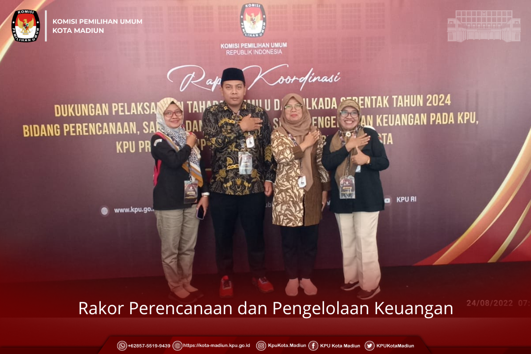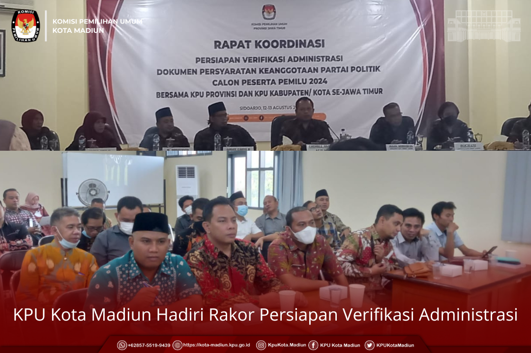 https://kota-madiun.kpu.go.id. (12/8) Jum'at, Pukul 15.00 WIB, Bertempat di Kantor KPU Kabupaten Sidoarja, Komisi Pemilihan Umum Provinsi Jawa Timur menyelenggarakan rapat koordinasi persiapan Verifikasi Administrasi dokumen persyaratan Partai Politik Calon Peserta Pemilu 2024 bersama KPU Provinsi dan KPU Kabupaten/Kota se-Provinsi Jawa Timur, yang diikuti oleh 38 KPU Kabupaten/Kota sesuai dengan surat undangan Komisi Pemilihan Umum Provinsi Jawa Timur Nomor : 1713/ PP.05.1/35/2022, tanggal 8 Agustus 2022, perihal Undangan.